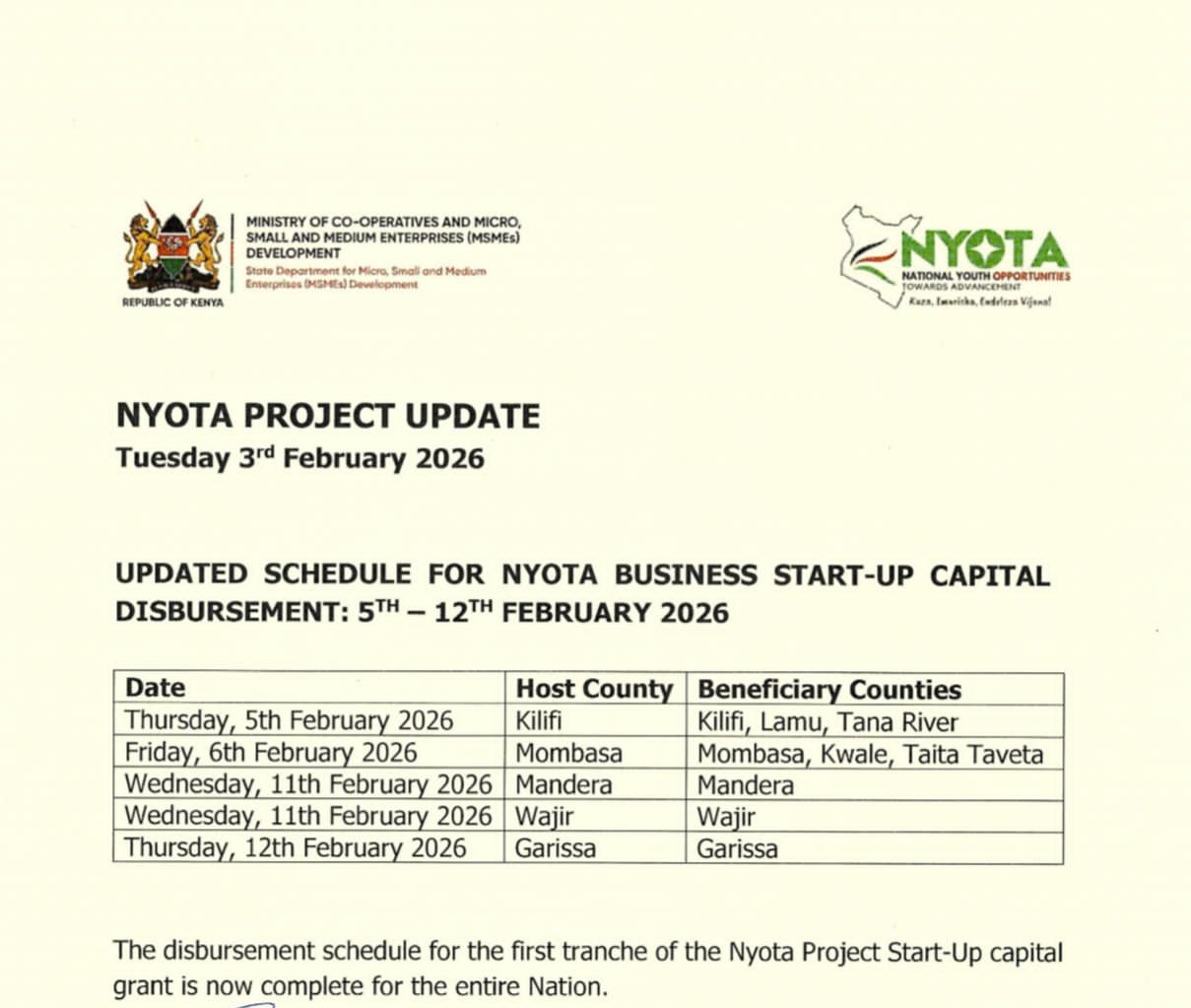 UPDATED SCHEDULE FOR NYOTA BUSINESS START-UP CAPITAL DISBURSEMENT; 22ND, 27TH & 28TH JANUARY 2026